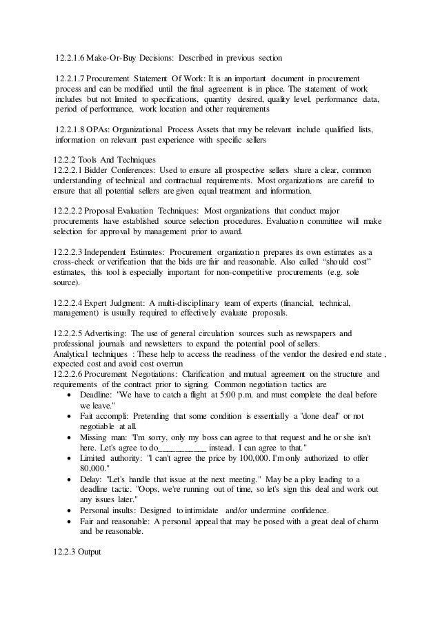 Source selection criteria are included in the procurement documents to give the seller an understanding of the buyers needs and to help the seller decide whether to bid or make a proposal on the work. A statement of work sow is required when purchasing commercial services. Visit the gsa statement of work library for sample sows.