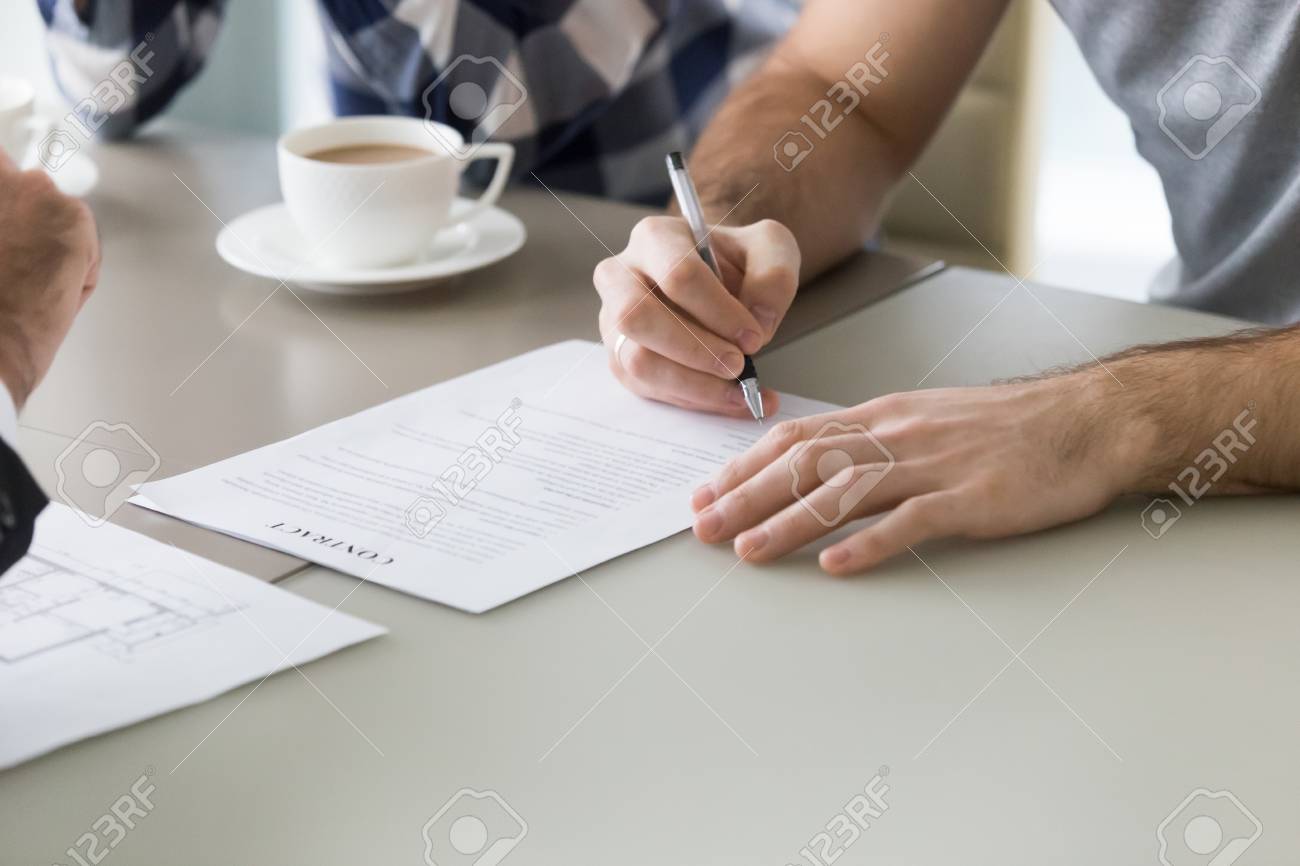 Family Couple Sign Mortgage Investment Loan Rental Contract With