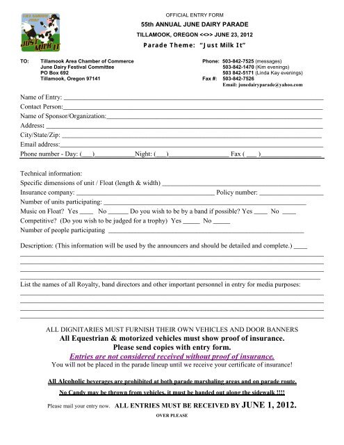 June Dairy Parade Entry Form Tillamook Chamber Of Commerce
