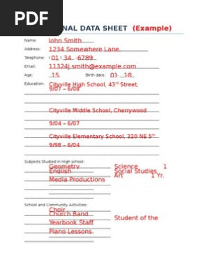 personal information personal data sheet sample,