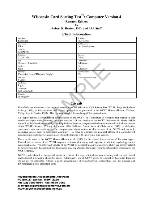 Wcst Cv4 Sample Report Psychological Assessments Australia